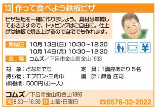コムズは第2回の飛騨金山まちゼミに参加します! 今回は自宅でもできる鉄板ピザのご紹介をします。 開催日:2019年10月13日 日曜日 10:30~12:30 2019年10月14日 祭日 10:30~12:30 会 場:コムズ 本社 岐阜県下呂市金山町金山1993 対 象:どなたでも 家族での参加OKです! 持ち物:エプロン・三角巾 教材費:500円(お一人) 定 員:1講座あたり8名 お問い合わせ:株式会社コムズ TEL.0576... 続きを見る