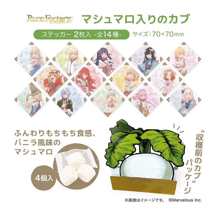 7月26日(金)より 「ルーンファクトリー展/岩崎美奈子 WORKS」有楽町マルイで販売中の「マシュマロ入りのカブ」について、同封されているステッカー枚数に誤りがございましたので、一時販売を中止させていただいております。